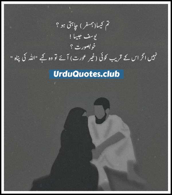 | Tum kesa humsafar chahti ho ? yusuf jesa ? khubsurat ? nhi agr uskay kareb ko aurat aye tu woh kahaye allah ki panah.. |